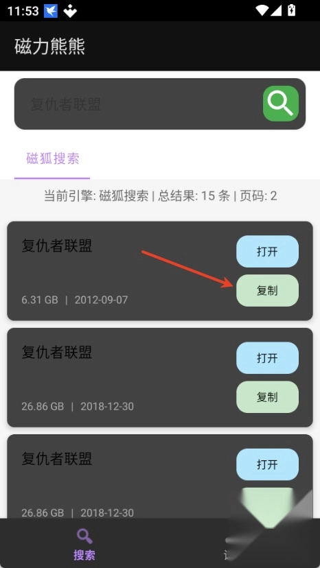 4、搜索结果支持一键复制磁力链接,也可直接调用外部工具。