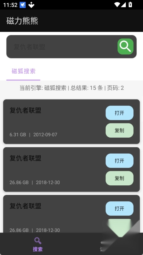 4、简洁高效的结果页清晰罗列了搜索结果的名称、大小、日期等信息,并支持一键“复制”磁力链接或直接“打开”进行,一切尽在您的掌控之中。