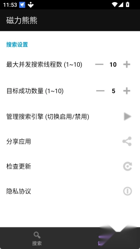 1、启动磁力熊熊应用,找到并点击设置里的“管理搜索引擎”选项,把所有常用的搜索引擎都勾选上,之后返回主界面。