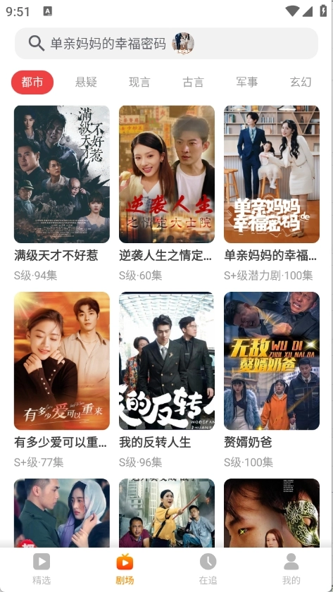 3、“剧场”页面涵盖多种短剧类型,包括悬疑、现言、古言等。