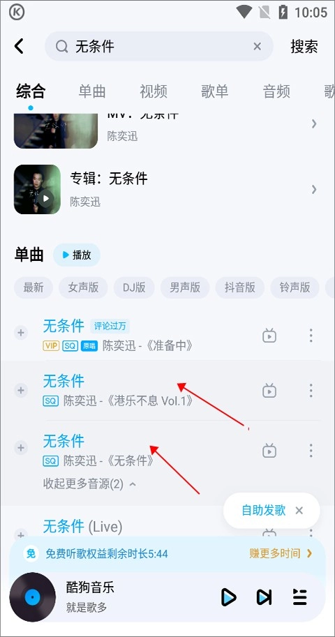 2、有些歌曲有多种音源,有些音源是免费播放的,例如《无条件》,用户搜索时显示的是vip,但是通过点击【更多音源】