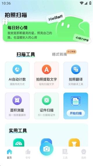 夸夸扫描工是一款助力高效办公的实用工具,能为用户提供丰富多样的扫描服务。它具备拍照翻译、试卷去手写、魔法擦除等多种实用功能,还拥有丰富的扫描转换工具,各类功能应有尽有,让用户轻松生成电子文档,并且支持多种文档格式之间的转换,既方便又实用!