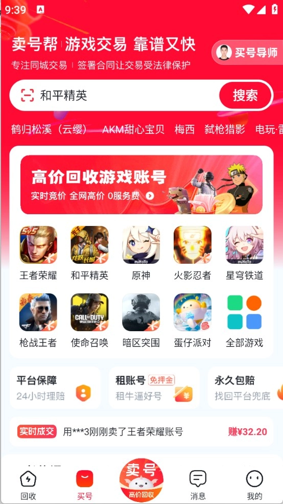 2、进入首页,有很多的热门游戏账号推荐,王者荣耀、和平精英以及蛋仔派对等
