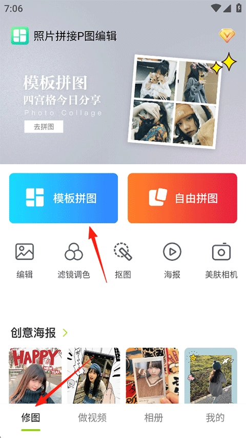 1、进入照片拼接P图编辑界面,在修图功能页面选择模板拼图选项;