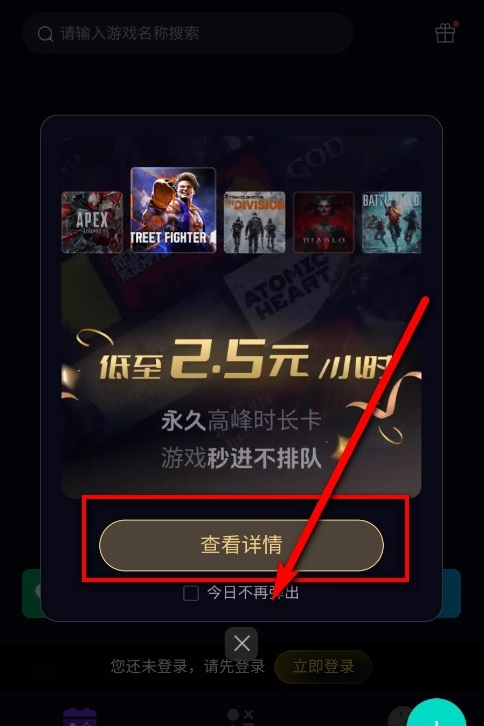 2、 进入后会有蒸好玩云游戏服务平台的活动提示,这里可以选择“查看详情”或是勾选“今日不再弹出”关闭