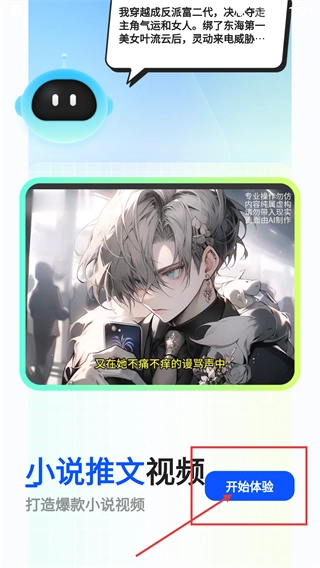 在小说推文视频的入口页面,点击【开始体验】按钮,就能进入这个AI创作工具应用,借助它来制作热门小说推广视频。
