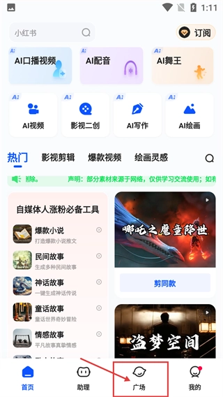 2、进入应用首页后,点击底部导航栏的【广场】选项,切换至广场页面,可查看其他用户的AI创作内容。