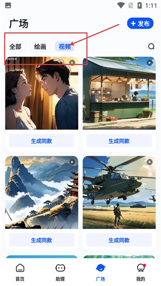 3、在广场页面,点击顶部的【视频】标签,筛选查看AI生成的视频类创作内容,可通过“生成同款”按钮参考创作。