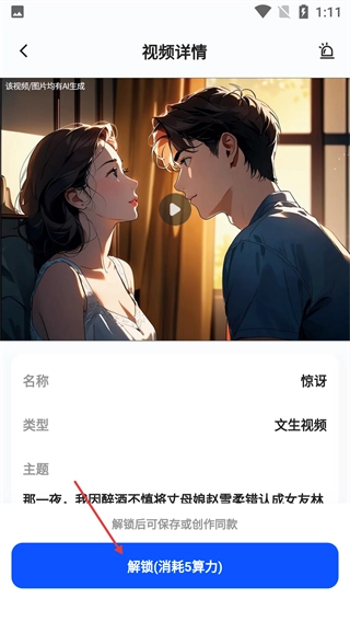 4、进入目标视频的详情页后,点击【解锁(消耗5算力)】按钮,消耗对应算力后,即可保存该视频或创作同款内容。
