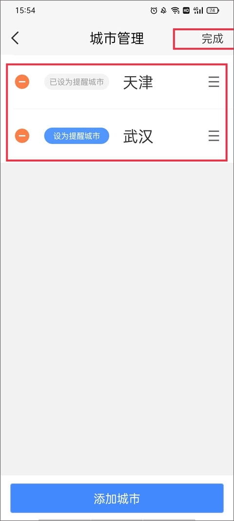 2、到达城市管理界面,点击下方的“添加城市”。