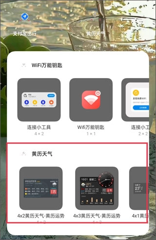 2、找到黄历天气小部件,长按部件样式拖动到桌面空白位置。