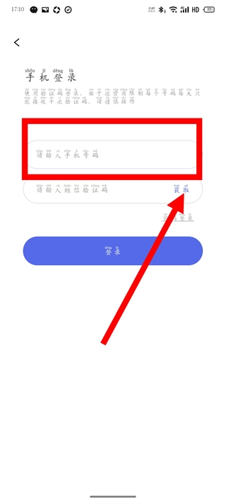 4、在手机登录页面,输入手机号码,点击获取验证码。