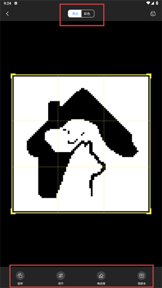3、在编辑页,通过【黑白/彩色】切换打印模式,利用【旋转】【调节】等功能调整图片效果。