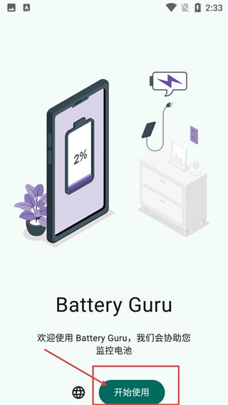 1、在【Battery Guru】的欢迎界面,这款应用能够帮助用户监控电池状态,点击【开始使用】按钮就能进入到接下来的操作流程。