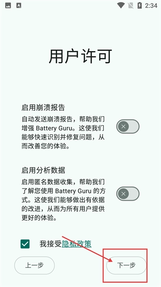 2、在【用户许可】页面,可选择启用【崩溃报告】-【分析数据】,勾选【我接受隐私政策】后,点击【下一步】推进流程。