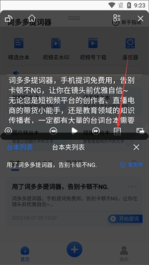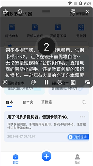 1、在首页下方任选一个台本,点击【开始提词】后,就能从【悬浮窗】、【提词板】、【拍摄提词】这三种提词模式里自由挑选。
