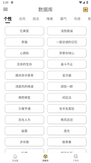 3、在数据库的页面中可以查看个性、古风、励志、唯美、霸气等不同类型的网名;