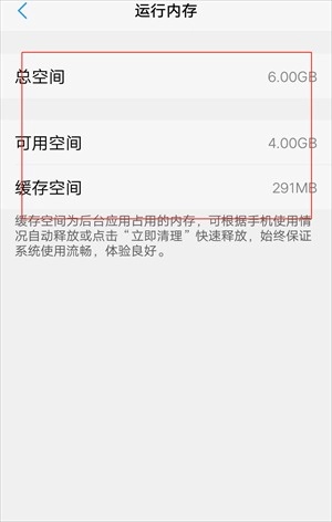 2、在运存与存储空间中即可查看手机内存总空间和可用空间(红框)