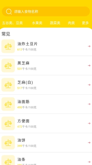2、点击热量查询,则能在这里看到很多食物的热量信息。