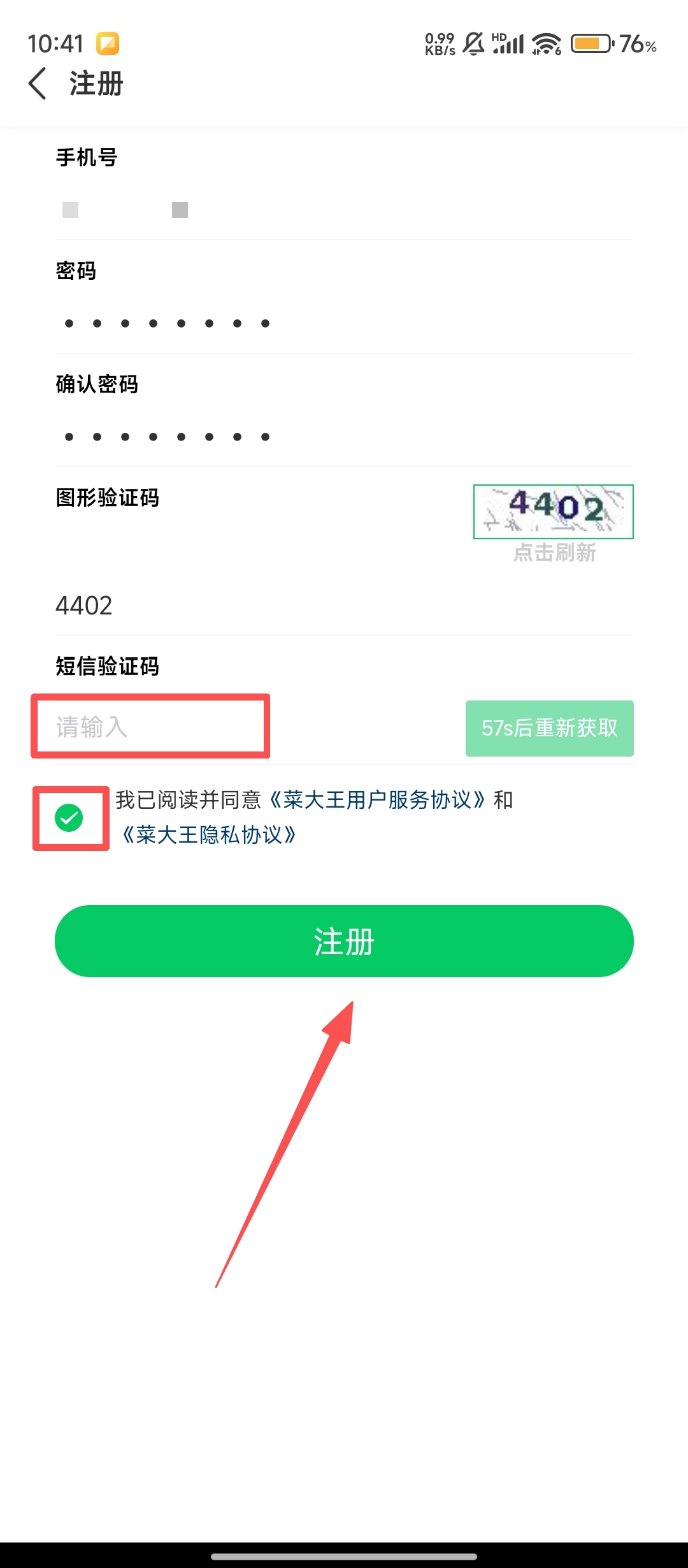 4、输入短信验证码,勾选协议后点击【注册】,就能完成账号注册啦。