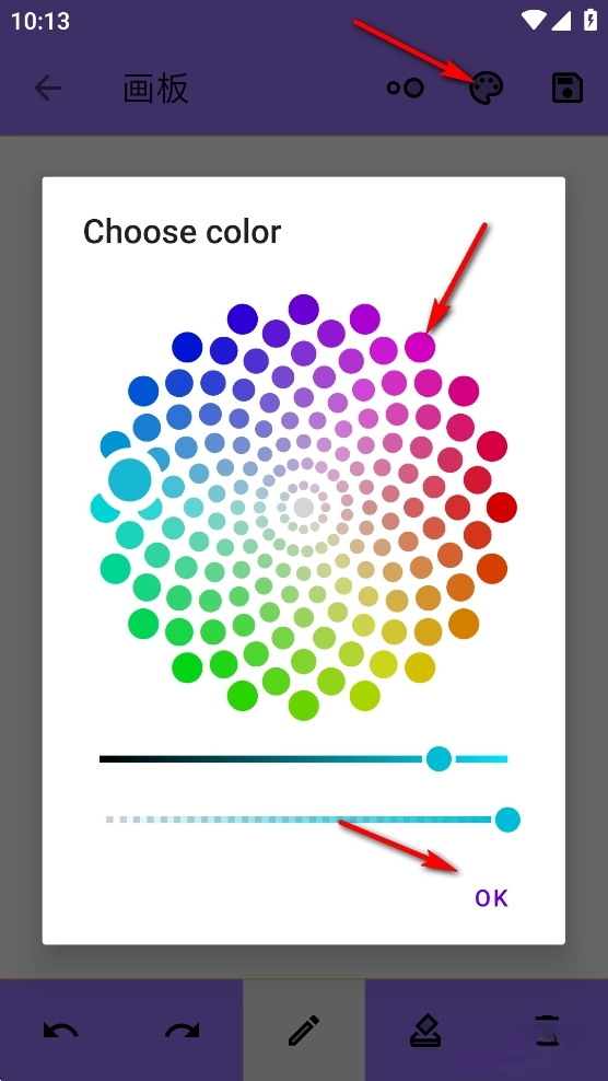 点击如图颜料按钮,选择颜色后点击【ok】