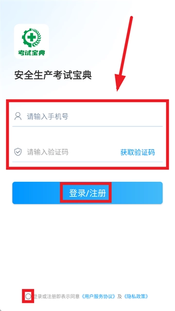 进入登录界面后,输入手机号和验证码,勾选“登录或注册即表示同意《用户服务协议》及《隐私政策》”,随后点击“登录/注册”按钮即可完成操作。