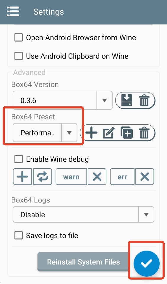 1、如果您遇到性能问题,请尝试将 Box64 预设更改为Performance“容器设置”->“高级选项卡”。