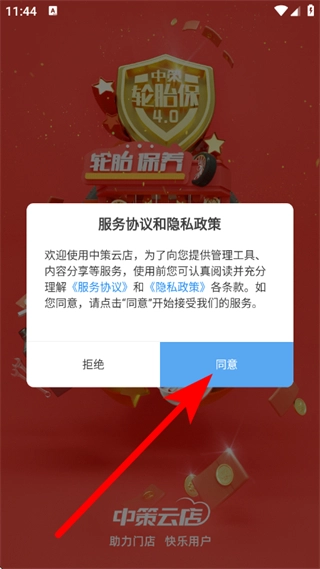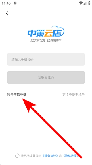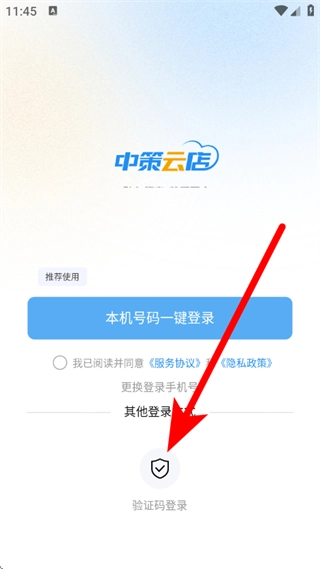 1、打开中策云店,待弹出服务协议窗口后,点击同意按钮,随即进入登录方式选择界面。