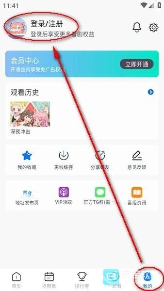 1、启动Omofun应用后,点击右下角的【我的】页面,再选择顶部的“登录/注册”入口。
