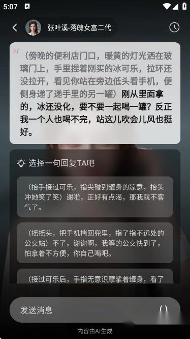 7、点击目标AI角色进入聊天窗口,输入文字或发送语音就能发起互动,AI迅速回复后可以继续深入交流。