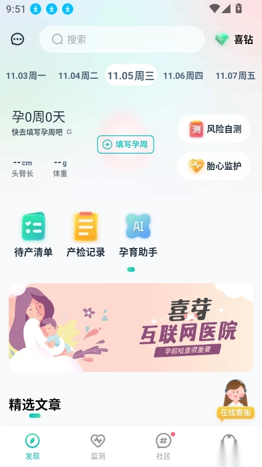 软件提供了妊娠风险自测,用户可以对自己的妊娠风险来实时自测,轻松自测风险。