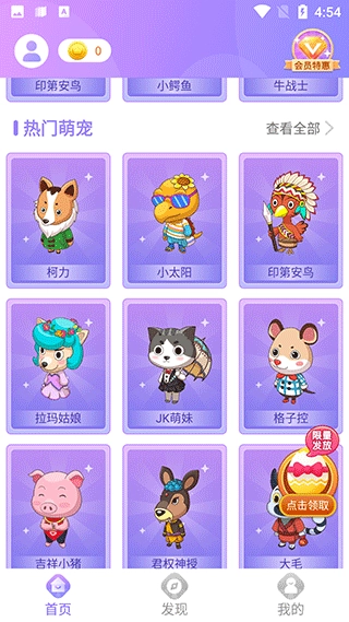 1、首先,在首页挑选你心仪的萌宠角色,这里有各式各样的萌宠可供选择;
