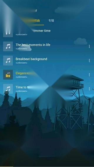 选择好主题之后,紧接着便来到了音乐播放器的主界面,在这里你可以选择自己喜欢的歌曲、专辑、艺术家,也可以查看当前的播放列表。