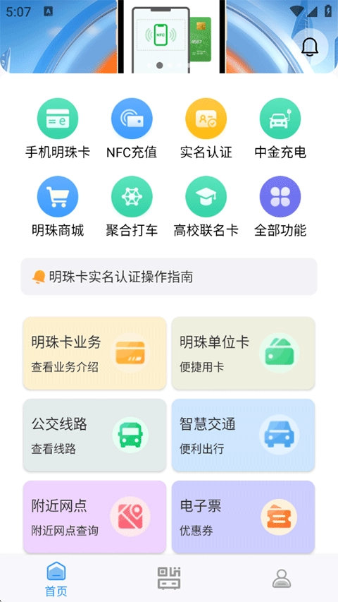 1、打开大连明珠卡应用,其首页整合了NFC、充电、商城、打车、手机明珠卡等丰富多样的生活服务板块;