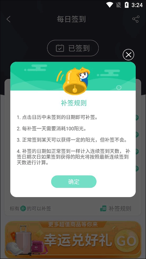 这个时候就有朋友问了,截图界面中日历内的许多补是什么意思,这些有写着补字的日期都是因为当天用户并没有进行签到,软件会给予用户补签的机会,但补签也是有条件的:每补签一天需要花费100的阳光,并且之前补签不能获取到每日的签到阳光,但会如同日常签到一样计入连续签到天数。