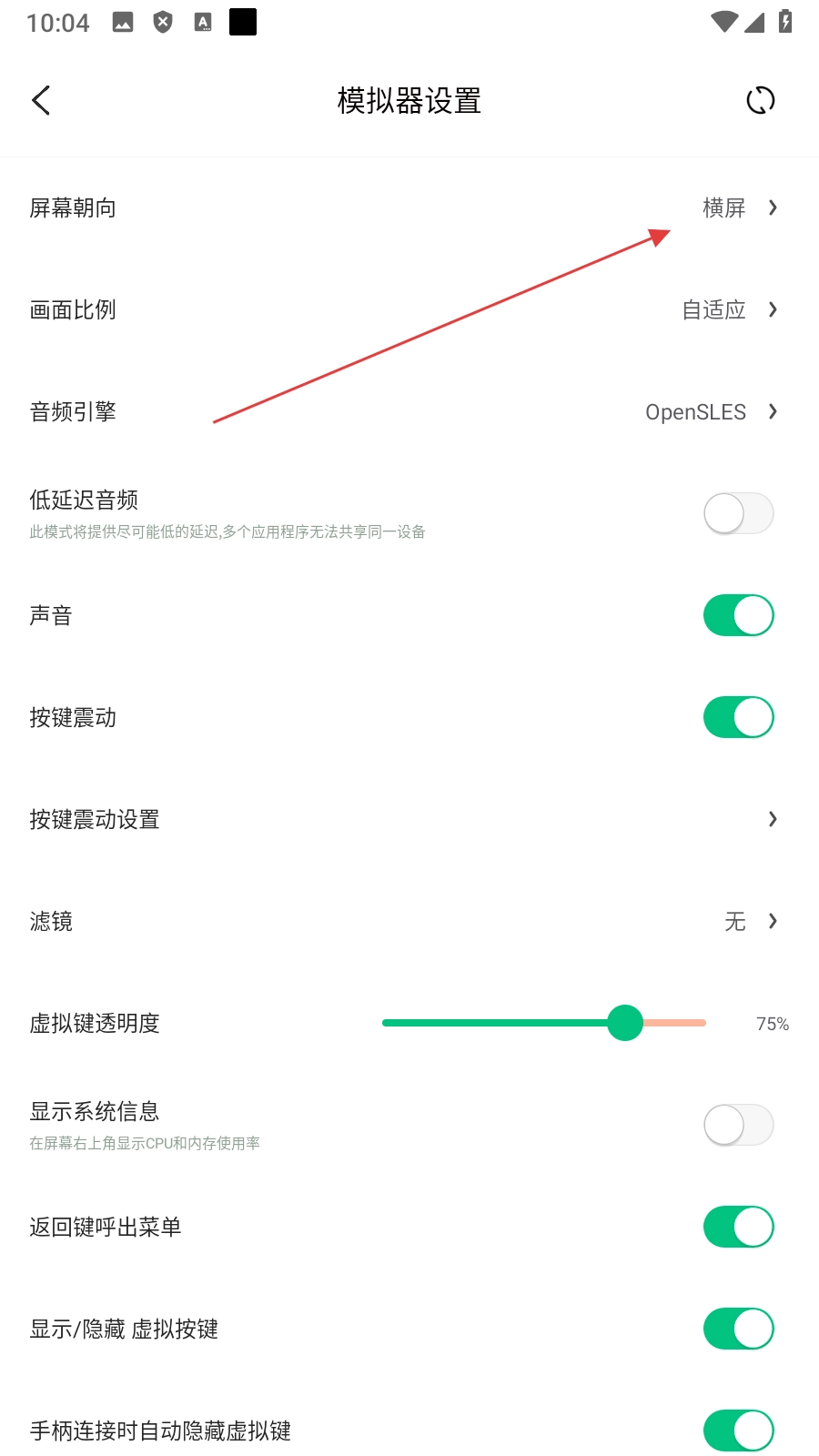 3、在模拟器设置页面,点击【屏幕朝向】,弹出屏幕方向选择弹窗。