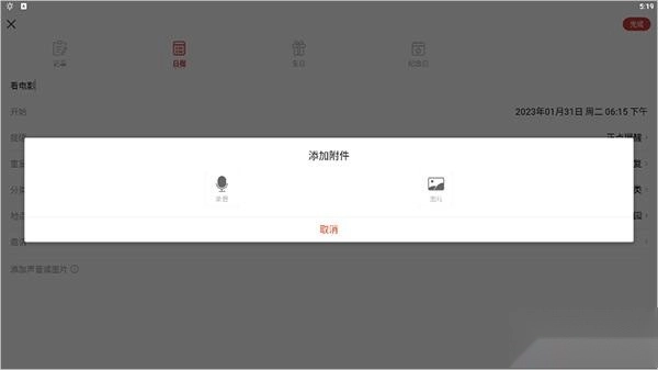 另外日程中还可通过点击【添加声音或图片】来添加录音和图片