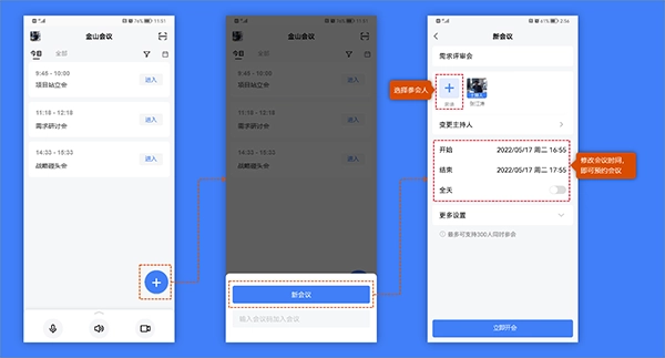 点击“+”按钮,再点击“新会议”按钮,即可创建会议。修改会议时间,即可预约会议。