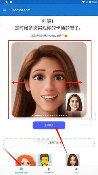 成功安装后打开应用,可左右滑动挑选一个心仪的toonme特效,接着选择照片。