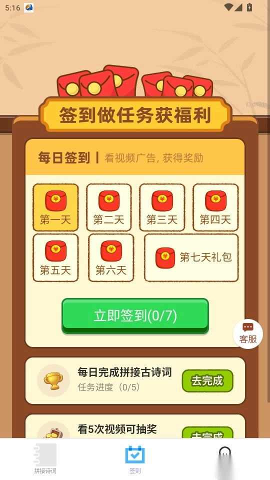 点点福旺最新版本是一款益智有趣的古诗词拼接赚钱软件,丰富的古诗词拼接关卡,用户可随时参与闯关挑战。通过拼接操作,既能检验对各类诗词的掌握程度,又能复习诗词知识,助力轻松探索学习更多古诗词内容,实现“玩乐中学习”的益智体验。软件还以闯关赚钱模式激励用户学习,为古诗词学习提供有效动力;丰富的赚钱任务可让用户积极完成以获取专属奖励,积累收益后随时提现使用。有需要的用户欢迎下载使用点点福旺!