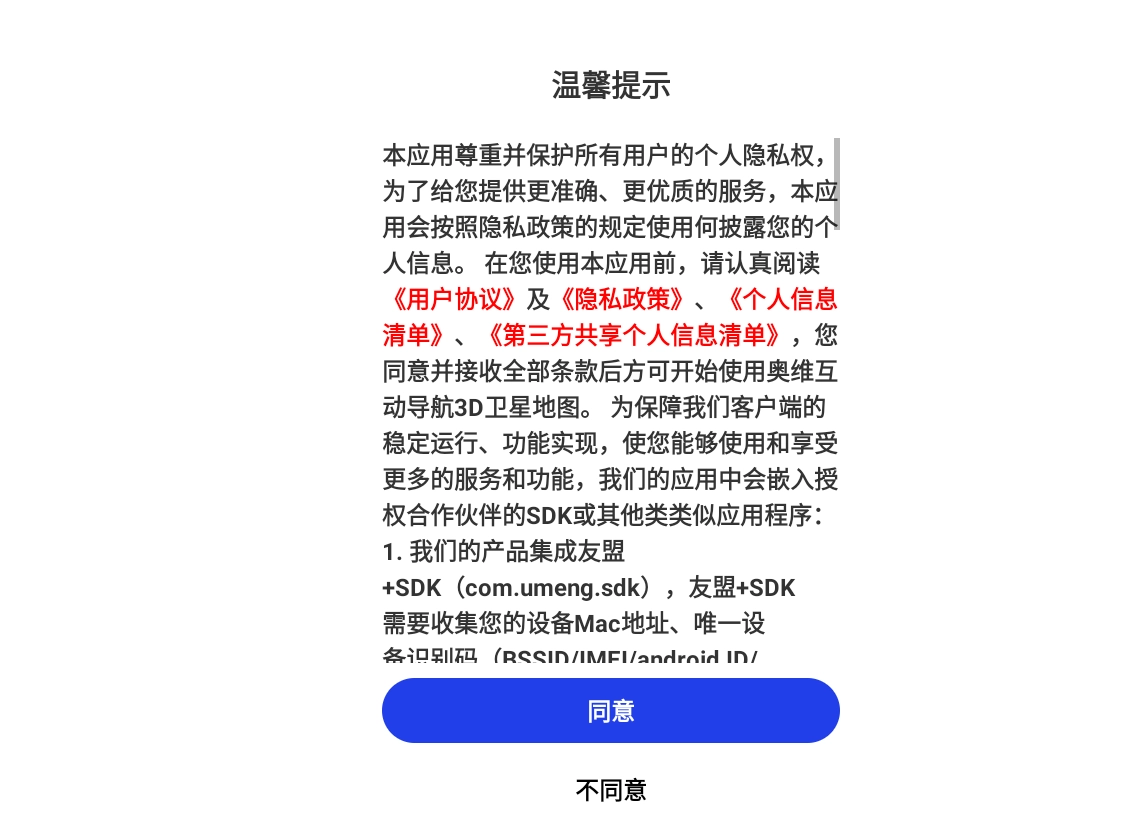 2、进入软件后,请仔细阅读用户隐私政策及服务条款,确保了解相关权限设置。