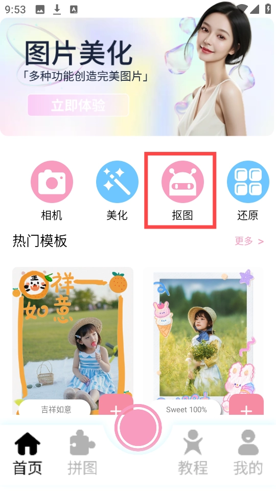2、主界面包含美化、抠图及拼图等多种实用功能,如截图所示。