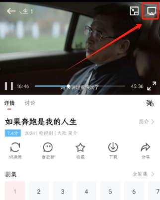 3、点击影视剧在播放的右上角找到电视的图标
