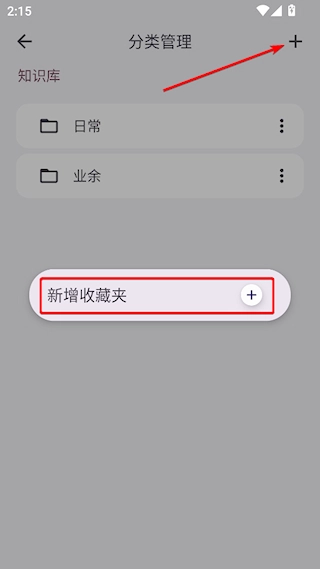 4、进入新建的收藏夹内,点击右上角的+新建分类