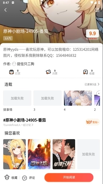 2.找到自己感兴趣的漫画之后,我们可以看到下图所示内容,我们选择开始阅读,就可以正式阅读漫画
