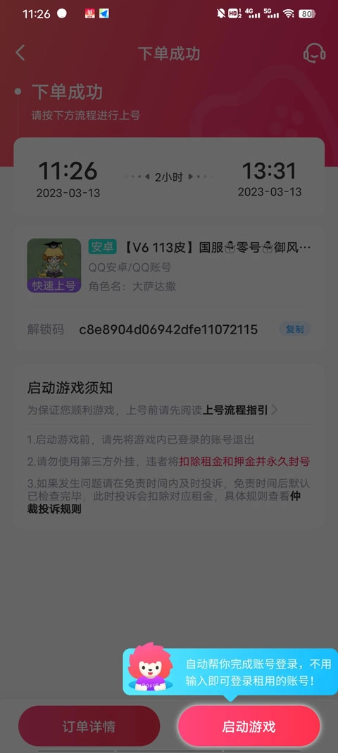 1、第一步,打开租号玩平台的订单页面,把对应的解锁码复制下来;
