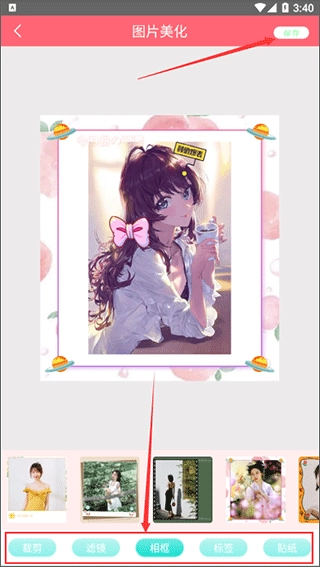 3、进入编辑界面后,底部会显示裁剪、滤镜、相框、标签等工具栏。根据个人喜好调整各项参数,完成后点击右上角的保存按钮;