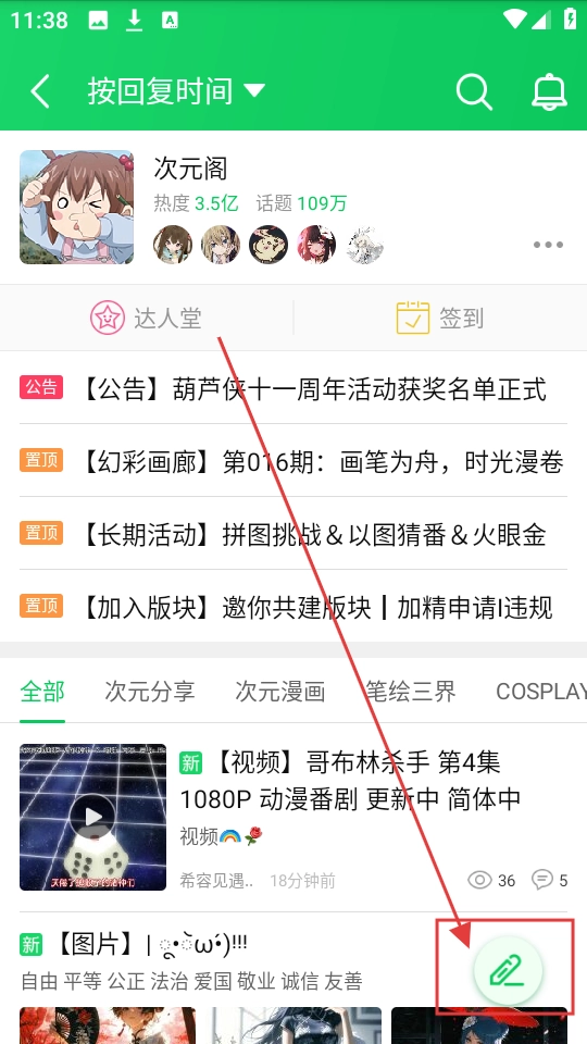 2、进入【次元阁】板块后,点击右下角绿色编辑按钮,就能准备发新话题啦。