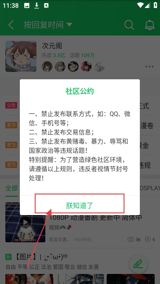 3、发话题前会弹出【社区公约】,看完后点击【朕知道了】,就能继续操作咯。