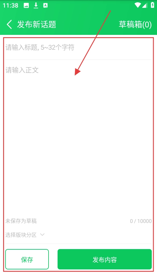 4、到了发布新话题页面,填写【标题】和【正文】,选好板块分区就能发布啦。